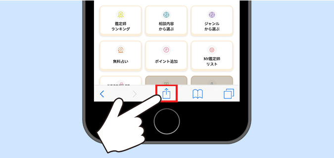 Safariでサイトへアクセスします。 画面下部にあるアイコンをタップし、Safariのメニューを開きます。